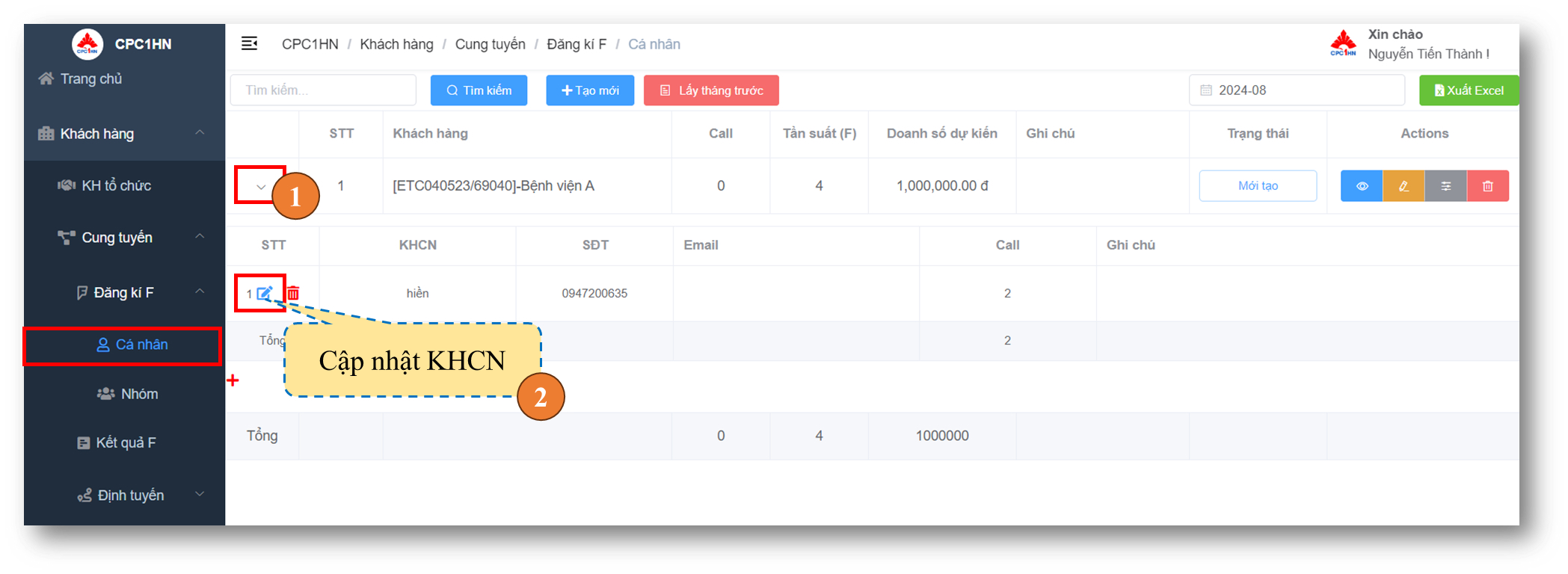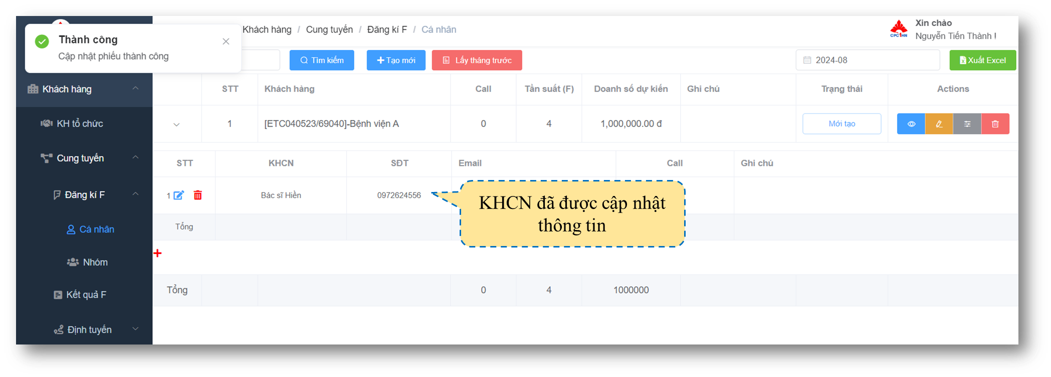 2. Bấm **cập nhật F cho KHCN**
